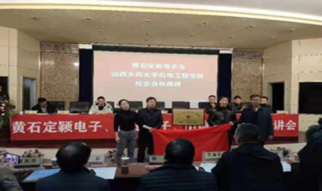 黄石市开发区铁山区人社局副局长胡雪萍、定颖电子(黄石)有限公司(大同大学实习单位)定颖电子HR冯淑怡、潘富国和武熙共同进行了揭牌仪式。